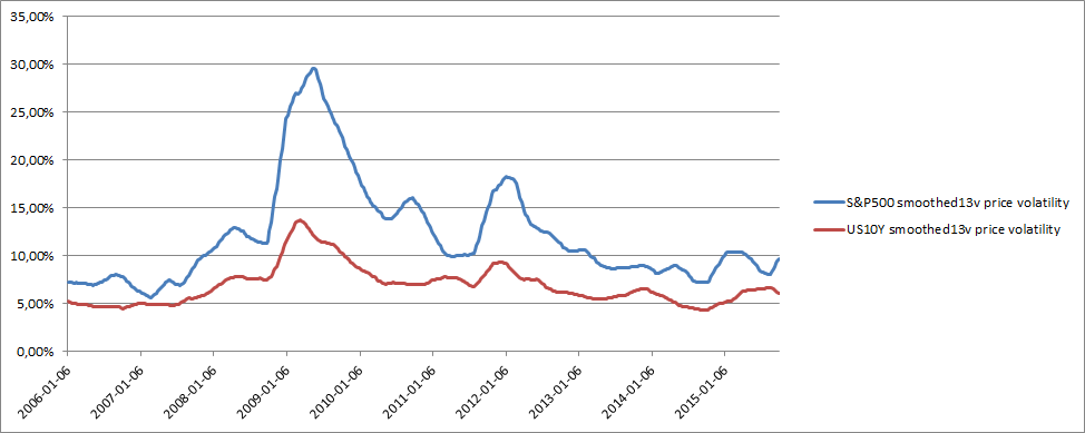 After the Yuan devaluation and very difficult times for many emerging markets, the Volkswagen scandal hits and the equity volatility rises. VIX also seems to be finding a new higher normal around 20-25 after spikes >30. Treasury volatility calmer than equity in this environment and not reacting as much to the upside. One factor that keeps treasuries calmer is the fact that in Yuan terms the return is a little bit better after the devaluation.