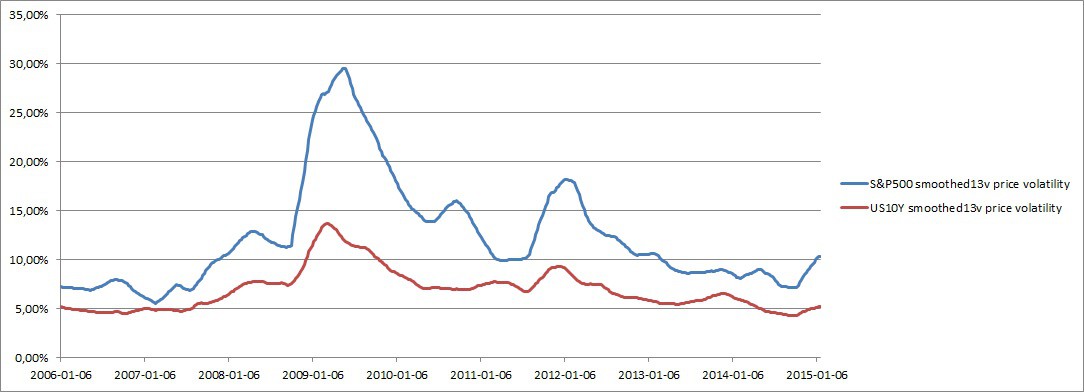 The series looks to be working in “alternating-fashion” in a way with big spikes in one being “safeguarded” by calm in the other. This being brought about by portfolio manager behaviour and central bank behaviour over different periods with different investing fashions in vogue, for example the Volcker-moves of the early eighties by Fed and risk parity investing today.